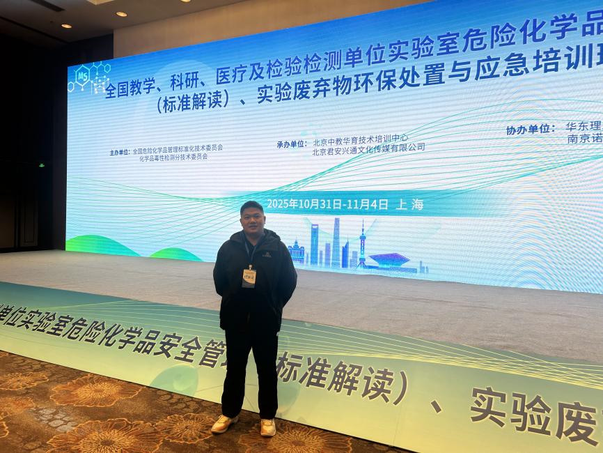 10月31日至11月4日,我院教师黄海涛参加2025年秋冬季“全国教学、科研、医疗及检验检测单位实验室危险化学品安全管理(标准解读)、实验废弃物环保处置与应急培训班”。该培训由全国危险化学品管理标准化技术委员会和化学品毒性检测分技术委员会主办,华东理工大学实验室与装备处协办。