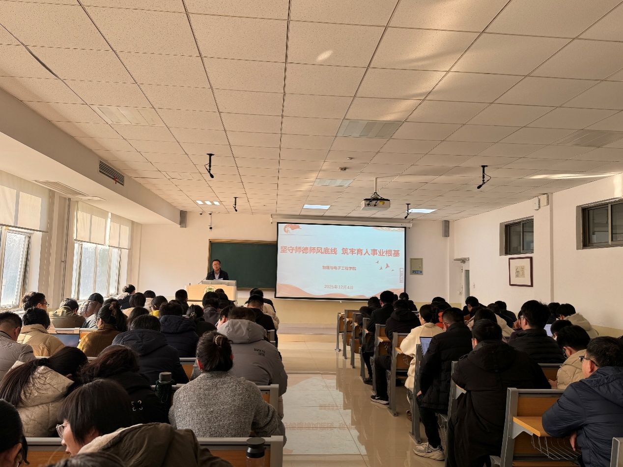 党委副书记辛允东为全体老师做了《坚守师德师风底线,筑牢育人事业根基》的专题报告,指出要将师德师风融入到日常教学管理的每一个场景中,助力学院建设发展的每项工作高水平推进。