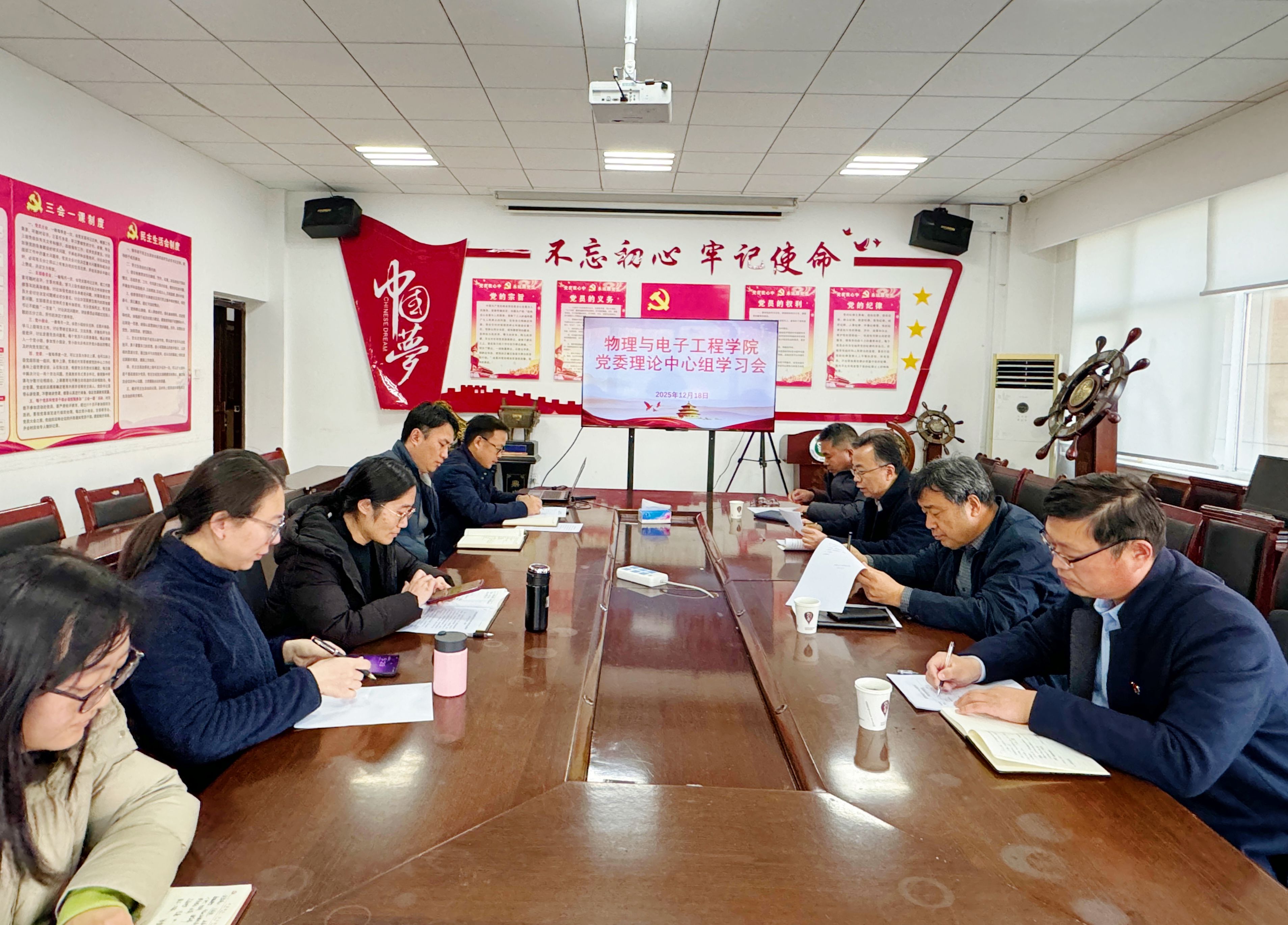 为深入学习贯彻党的二十届四中全会精神,精准把握“十五五”规划建议核心要义,切实将理论学习成果转化为推动学院高质量发展的强大动力,12月18日下午,物理与电子工程学院在9号楼学院会议室召开理论学习中心组学习会。学校党委副书记、校长王清明,校长办公室副主任孔瑞列席会议,王清明校长作指导讲话。学院党委书记卫建勋主持会议,学院理论学习中心组成员参加学习。