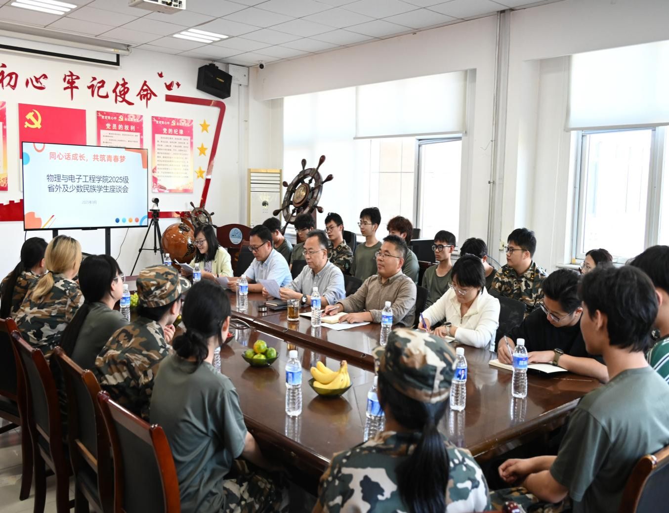 9月25日下午,物理与电子工程学院在学院会议室召开“同心话成长,共筑青春梦”2025级省外及少数民族学生座谈会。学院党委书记卫建勋、院长岳现房、党委副书记辛允东及辅导员郝晓琳、晁尚志出席会议,与40余名来自外省及不同民族的2025级新生共话成长、共筑梦想。会议由团委书记赵杨洋主持。