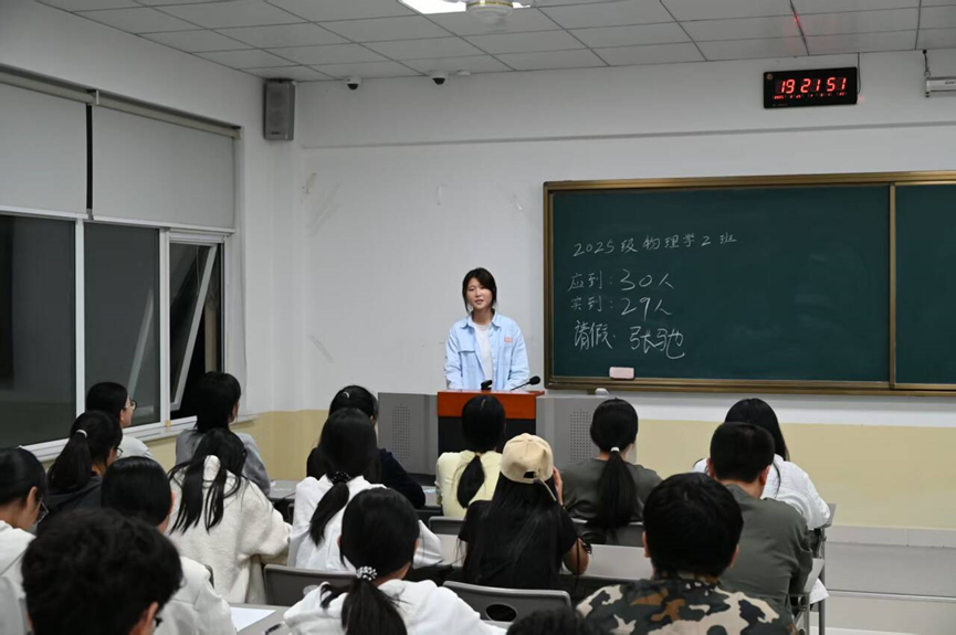 25物理学2班带班王永昌聚焦“校园适应”,筹备“校园规则与心理健康”主题班会:不照本宣科,将宿舍管理、课堂纪律等校规融入日常场景,结合自身经历讲清“守规则的意义”;聊到心理健康时,以自己曾面临的学业压力、人际难题为切入点,引导新生正视情绪、主动沟通。