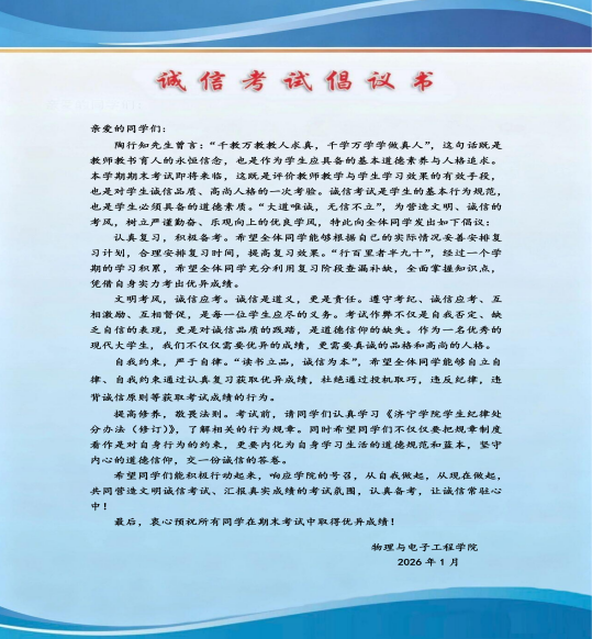为持续强化学风建设,引导学生端正考风、诚信应考,近日,物理与电子工程学院开展“铸牢诚信根基 护航清朗考风”主题教育系列活动。